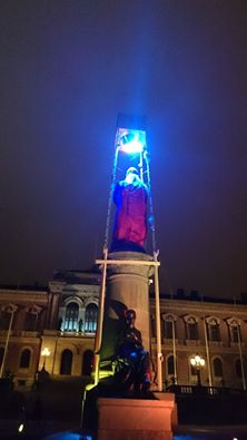 någon hade dekorerat John Börjessons staty av Erik Gustaf Geijer. Först trodde jag att det var något spontant initiativ liknande de textilarbeten som klär en del andra statyer eller stolpar här i staden. Men sen såg jag att det var något mera än så och dessutom auktoriserat uppifrån. Det var helt enkelt en del av projektet ”Allt ljus på Uppsala” som kommunen driver tillsammans med en massa olika företag. Tre stycken LED strålkastare är monterade på trefoten och belyser en discokula med färgat ljus. Statyn är beklädd med tyg och Geijers näsa med ett par runda glasögon.