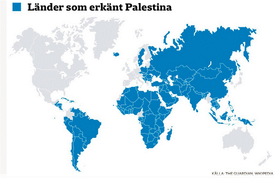 När Sverige i oktober 2014 erkände Palestina så kastade sig borgerligheten och den svenska Israel-lobbyn över utrikesminister Wallström. Man kunde då få intrycket att Sverige stod helt isolerade i detta beslut. Men sanningen är att EU och USA står isolerade mot resten av världen som har erkänt Palestina. Det framgår av denna karta: