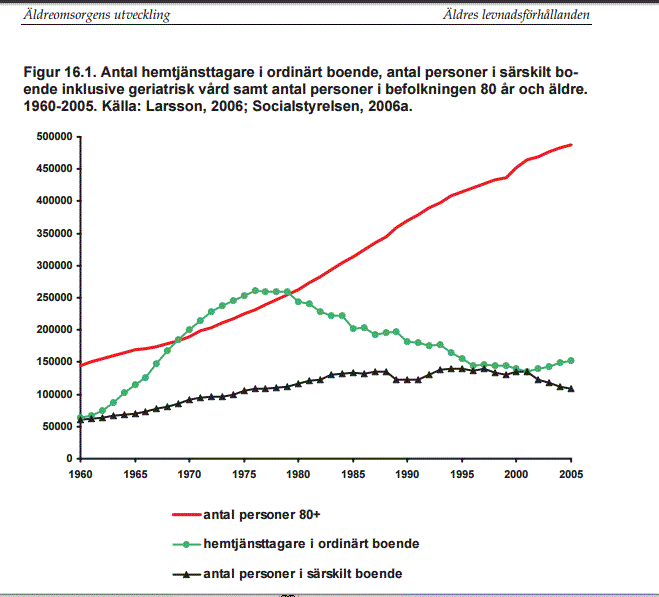 Enligt SCB ökade antalet personer i ålderdomshem, sjukhem, servicehus och andra särskilda boendeformer för äldre i stort sett fram till 1990-talet. Men från år 2000 syns en tydlig nedgång. Kommunernas bruttokostnader per invånare som var 80 år och äldre var 15 procent lägre år 2000 jämfört med 1990 samtidigt som kostnaderna koncentrerades till personer med stora behov av omsorg. År 2001 bodde över 118 000 personer på äldreboende, år 2006 hade det minskat till drygt 90 000.