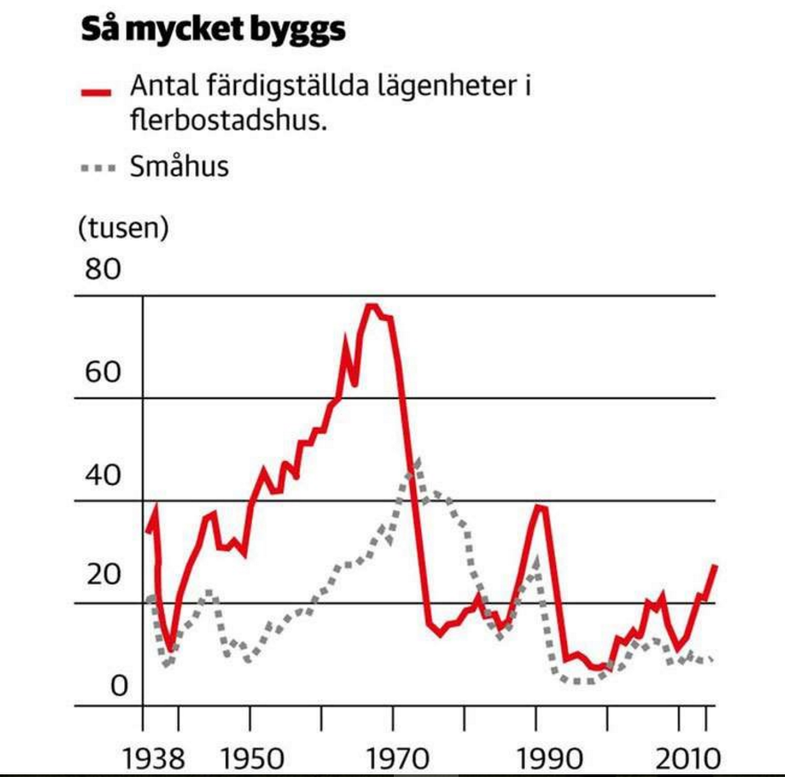 bostadsbyggandet också minskat ordentligt sedan 1950- och 60-talet, men även i jämförelse med början av 1990-talet. Det finns idag enligt Boverket 4,5 miljoner lägenheter i Sverige. Av dessa är 1,6 miljoner hyresrätter, 1 miljon bostadsrätter och resterande 1,9 miljoner i huvudsak ägda småhus.