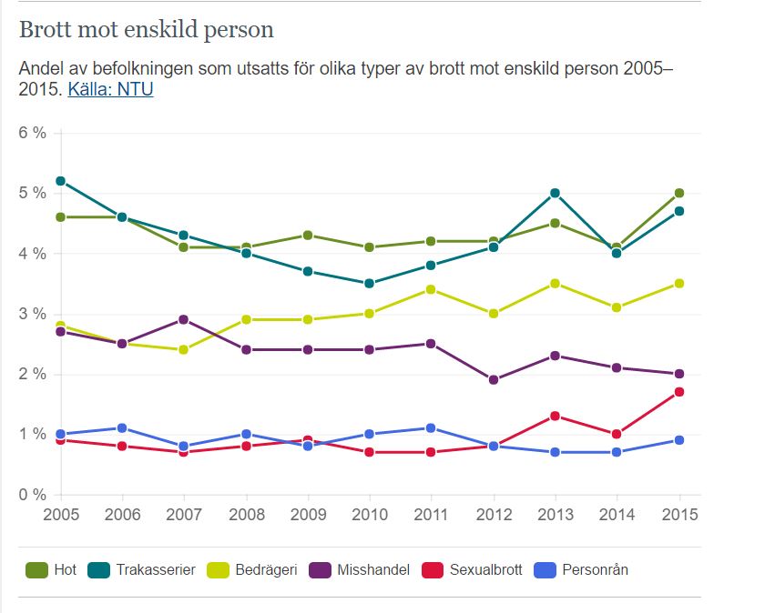 Så här har utvecklingen sett ut vad gäller olika typer av brott som drabbat ”enskild person” enligt Brottsförebyggande rådet (BRÅ) :