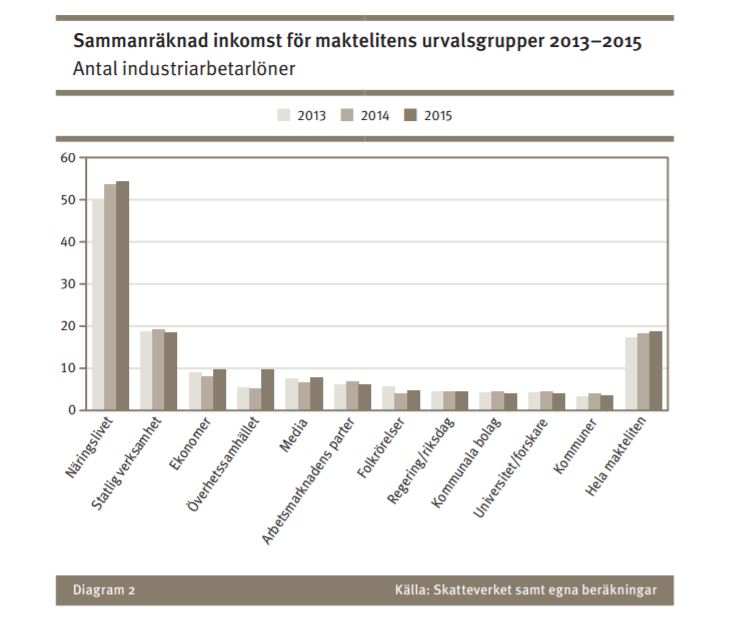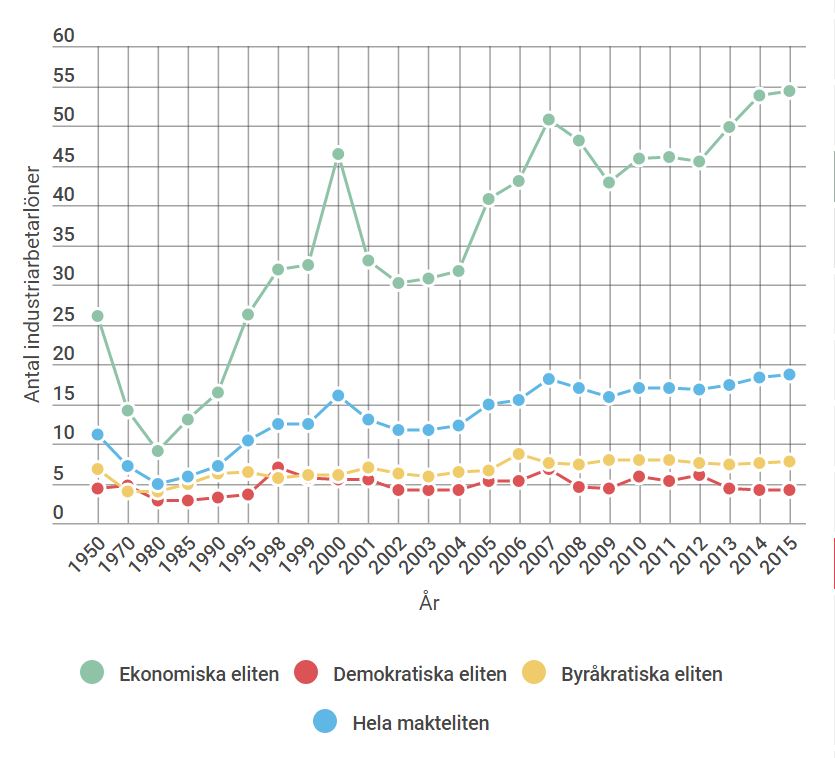 I rapporten gör man en uppdelning i tre olika grupper för att visa denna utveckling från 1950 och fram till nu. Man jämför den ekonomiska, den demokratiska och den byråkratiska eliten och konstaterar att ”Skillnaderna i genomsnittlig inkomst mellan de tre grupperna är stora. Av de tre grupperna är det framför allt den ekonomiska eliten, vilken omfattar 50 verkställande direktörer på svenska storföretag, som har ökat sina inkomster i förhållande till industriarbetarlönen de senaste årtiondena”.