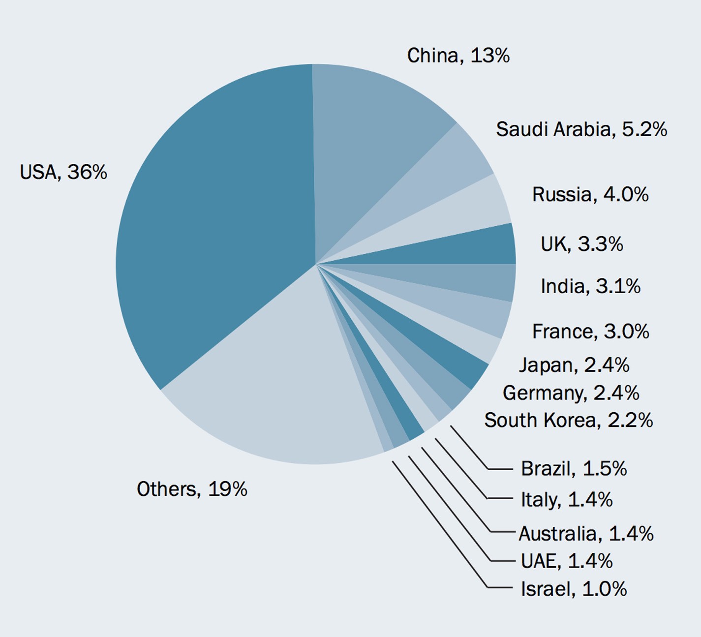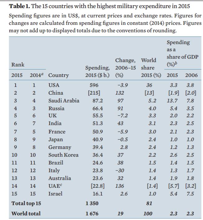 I den tid vi lever, där hotet från öst åter har blivit något som knappt går att ifrågasätta i Sverige så kan det vara intressant att jämföra denna ökning av USA:s militära kostnader med Rysslands. Rysslands militärutgifter som minskade enormt efter Sovjetunionens sammanbrott har visserligen ökat under de senaste åren. Men som framgår av den bifogade tabellen från SIPRI så var Rysslands totala militärutgifter 66,4 miljarder dollar år 2015. Den planerade ökningen av USA:s militära utgifter är alltså mer än 80 procent av det som Ryssland spenderade totalt 2015. Detta år 2015 spenderade USA totalt 596 miljarder. Som framgår av nästa tabell (som också är från SIPRI och visar andelarna av världens militärutgifter bland de femton länderna med de högsta utgifterna) så har USA kvar sin totalt dominerande ställning även utan denna kraftiga upprustning.