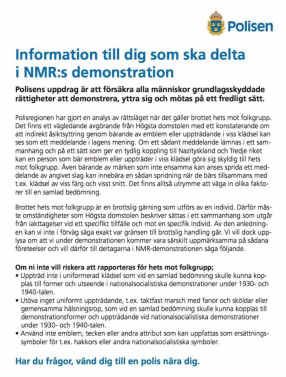 Och vad ska man säga om det brev (se här bredvid) som polisen i Göteborg skickat till NMR där man ger dem tips om hur de ska kunna genomföra demonstrationen utan att bli lagförda för hets mot folkgrupp? Råden är att NMR inte ska uppträda i uniformer, ”uniformt uppträdande” eller använda symboler som får en att tänka på deras historiska idoler de tyska nationalsocialisterna.