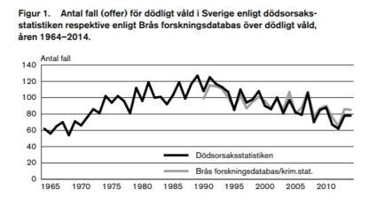 Om vi går till BRÅ:s statistik minskade faktiskt det totala dödliga våldet i Sverige från början av 1990-talet (se tabell1).
