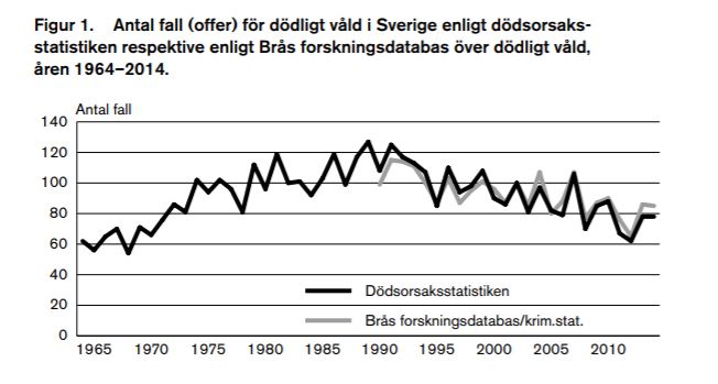 Om vi går till BRÅ:s statistik minskade faktiskt det totala dödliga våldet i Sverige från början av 1990-talet (se tabell1).