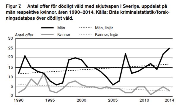 Inte ens det dödliga våldet med skjutvapen ökade enligt BRÅ från 1990-talet och fram till 2014 (se tabell 2) Som tabellen visar blev fler män (linjärt) men färre kvinnor offer för detta dödliga våld med skjutvapen.
