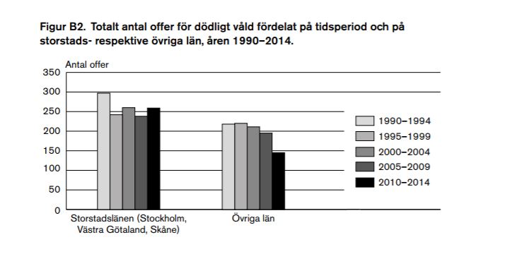 Alltså: under flera decennier har vi inte haft någon total ökning av dödligt våld. Däremot förändrades detta våld. Användande av legala jaktvapen vid dödsskjutningar minskade. Färre kvinnor drabbades. Våldet förflyttades mot storstäderna. Det var mer gängkriminellt våld med illegala handeldvapen i fattiga förorter. Fler män drabbades.