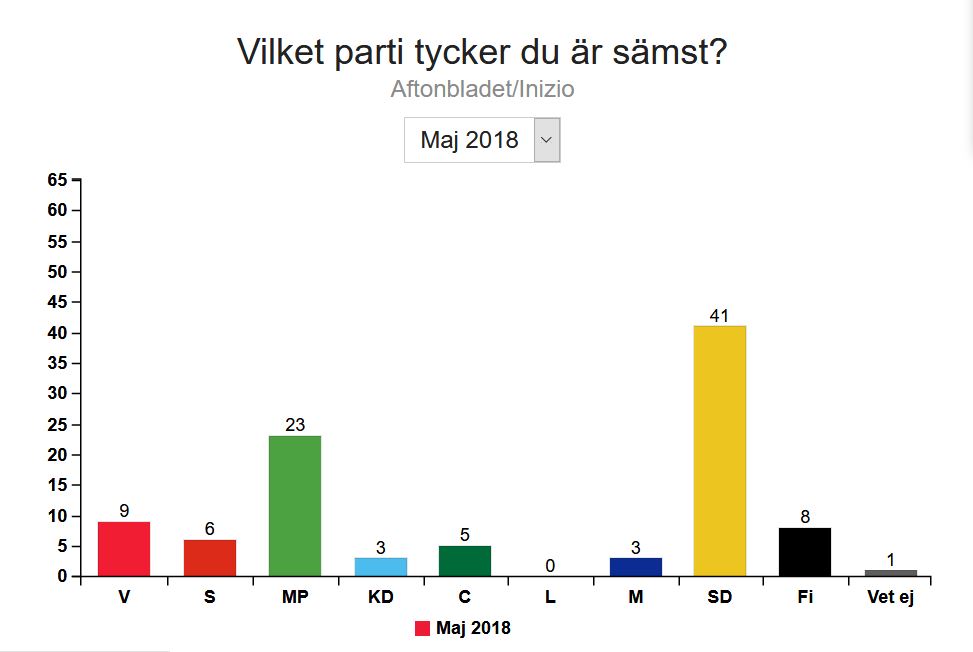 av Aftonbladet/Inizio fick de tillfrågade svara på frågan om vilket parti de tyckte var sämst. Det klart mest ogillade partiet (41%) var SD. Men även MP stack ut med 23 %. Jag undrar vad det går att dra för slutsatser av det?