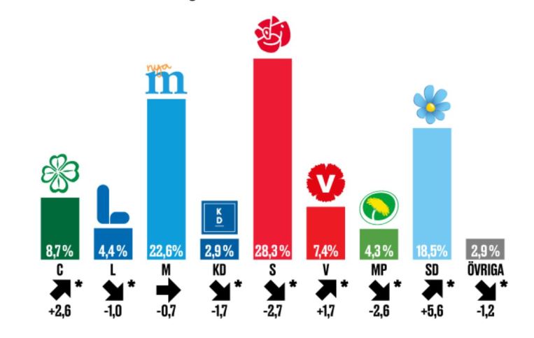 SCB kom nyligen med sin statistik från maj 2018 över hur valresultatet skulle bli ifall deras senaste opinionsundersökning stämmer. Alla partier går enligt denna undersökning bakåt i förhållande till valresultatet 2014 utom SD och V och C. Men C har backat från de noteringar de haft under valperioden.