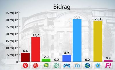 Att SD hade mycket ekonomiska resurser till sitt förfogande framgår nu som en följd av att lagen om öppen redovisning antogs 2014. De partier som får mest pengar (m+sd) var de som mest motsatte sig denna lag. De hade väl anledning att tänka att den som spårade pengarna kunde dra en del ofördelaktiga slutsatser. Som ni kan se hade dessa två högerpartier resurser totalt överlägsna de andra partierna.