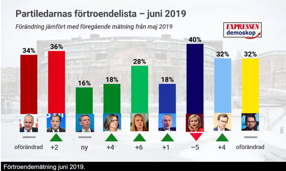 - När vi röstar får vi bara rösta på ett parti. Summan av de angivna (och icke angivna) rösterna blir då 100 procent. Men i dessa undersökningar får man uppenbarligen ”rösta på” eller uttrycka sitt förtroende för ett flertal partiers ledare. Ta till exempel den senaste mätningen från demoskop i juni 2019.