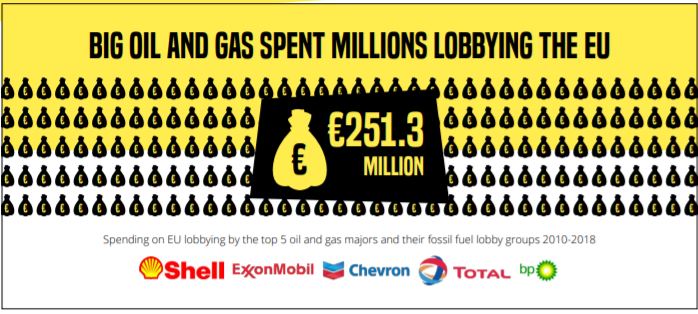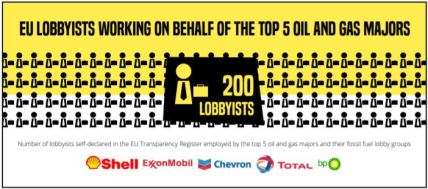 Rapporten berättar om att de fem största olje- och gasföretagen – BP, Shell, Chevron, ExxonMobil och Total – mellan år 2010 och 2018 har använt minst 2,7 miljarder kronor till lobbyverksamhet i EU för att påverka klimatpolitiken. De sysselsätter 200 lobbyister i Bryssel. Dessa lobbyister har hållit 327 möten med EU: s högsta tjänstemän sedan 2014. Alltså mer än ett möte per vecka.