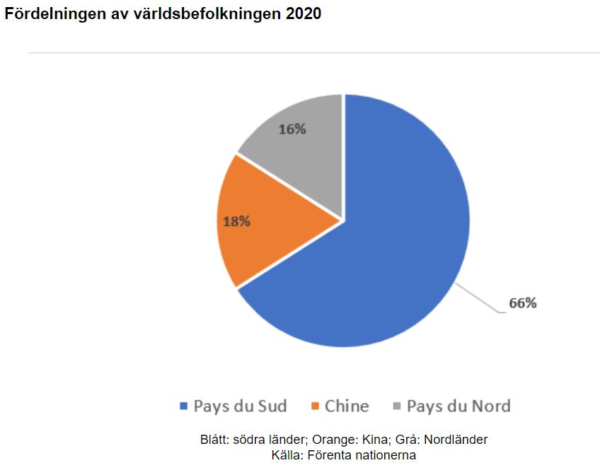 De skiljer ut Kina och delar resten av världen i Nord och Syd. I Syd lever då i dagens värld majoriteten av människorna: 66 procent (se bild).