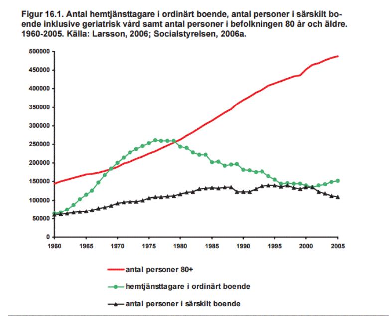 Jag (och många andra, men inte tillräckligt många) har skrivit om det förut. I en blogg från 2016 kan du hitta lite siffror och statistik om hur utvecklingen sett ut mellan 1960 och 2005. Likaså i en blogg från 2018 som berättar om att nio av tio kommuner minskade resurserna till äldreomsorgen. Detta år fick äldreomsorgen 20 miljarder mindre än vad den skulle ha fått om andelen av totalkostnaden hade legat kvar på samma nivå som för 20 år sedan.