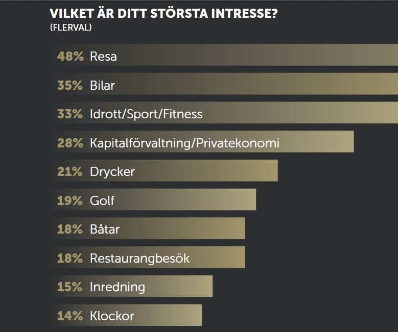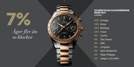I denna grupp är man mycket intresserad av att äga klockor och bilar. Connoisseur undersöker nämligen detta liksom en del annat. När man 2016 undersökte det i den här gruppen var det 7 procent som ägde fler än tio klockor. Och det var dyra klockor också. Det var dessutom 14 procent i gruppen som angav detta som ett ”intresse”, medan 35 procent angav bilar (i plural) som ett intresse. Trettio procent av dem hade också tre, fyra, fem eller fler bilar per hushåll.