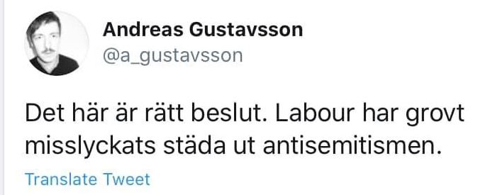 Nu nås vi av nyheten att den tidigare Labour-ledaren Jeremy Corbyn blir avstängd från partiet med hänvisning till en rapport om antisemitism i partiet under den tid då han ledde det. Tyvärr ser jag att ETC:s ansvarige utgivare Andreas Gustavsson tycker att detta är ”rätt beslut”. Själv tror jag inte på beskyllningarna om antisemitism mot Jeremy Corbyn. Jag har inte sett några övertygande argument för det. Istället tror jag att detta handlar om att den högerfraktion med Keir Starmer i spetsen som tagit över ledningen i Labour använder detta för att komma åt Corbyn och vänstern inom partiet.