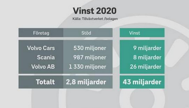 En undersökning gjord av SVT visar nu att många storföretag gått med stora vinster men ändå mottagit stöd av staten trots att de alltså inte hade ”allvarliga ekonomiska svårigheter”. Speciellt tre storföretag sticker ut: Volvo AB, Volvo Cars och Scania. De har mottagit 2,8 miljarder i stöd samtidigt som de gått med 43 miljarder i vinst.