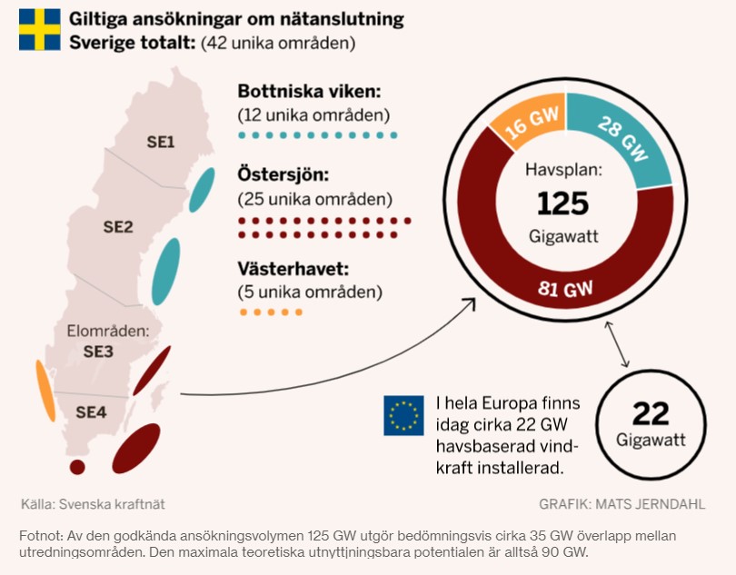 I Nederländerna går nu utbyggnaden av havsbaserad vindkraft mycket snabbt. Så är det inte i Sverige. För samtidigt som intresset, i form av ansökningar, är jättestort för att få starta anläggningar, så står det still. Enligt DI så fanns det i maj 2022 ansökningar som skulle motsvara en kapacitet på 125 Gigawatt installerad effekt. Trots detta byggs det inte något. ”Långa och ovissa tillståndsprocesser” gör att det står still enligt branschföreningen Svensk Vindenergi. Krigsmakten har här varit en mycket viktig bromskloss. I oktober låg det enligt DI ansökningar om havsbaserad vindkraft för uppemot 400 miljarder kr och väntade på ställningstagande från Tidölagets regering.