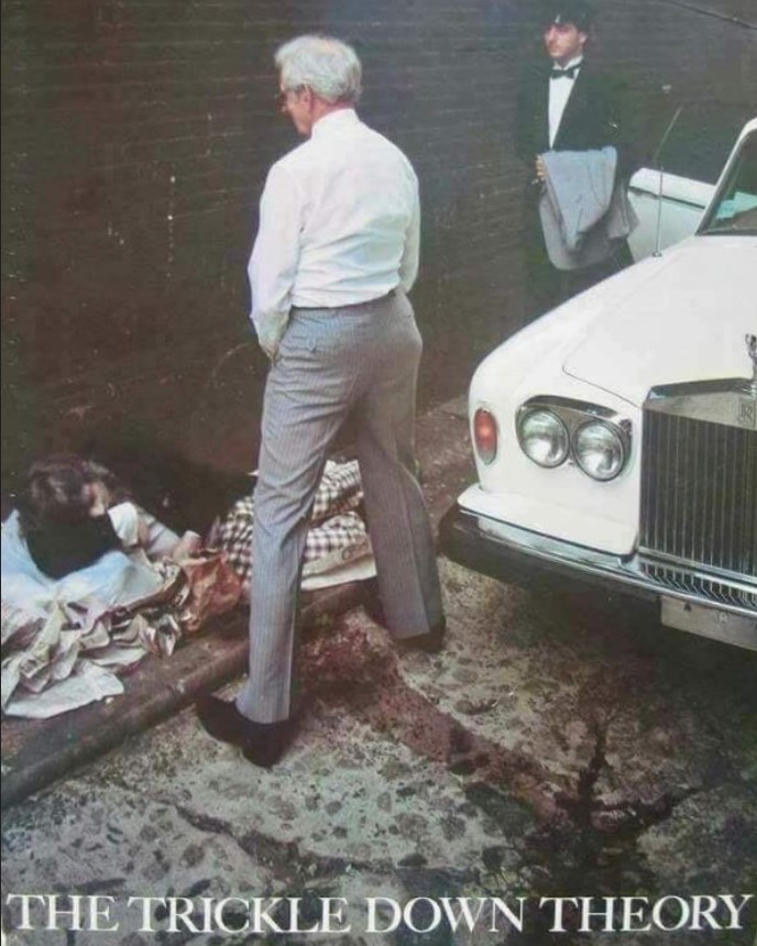 Traditionella borgerliga företrädare brukar däremot för det mesta försöka visa att deras förslag är till för alla. Även när de gynnar de rikaste med skattesänkningar så ska det, enligt deras sätt att resonera, genom sina effekter rinna ner ( Trickle down) i samhället så att det även gynnar de med sämre inkomster.