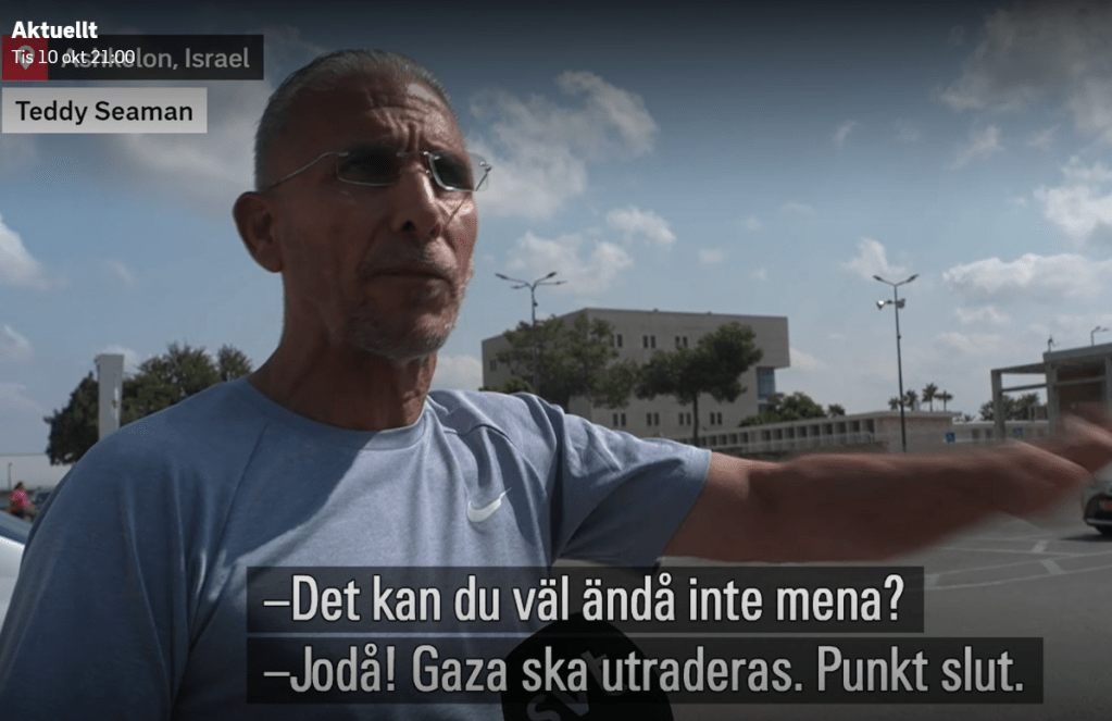 På TV ser jag Aktuellts reporter intervjua en Israel som säger att människorna i Gaza ska utrotas. Reportern frågar då chockad: ”menar du det”, ”det bor ju 2 miljoner där”. Den intervjuade bekräftar då att det är utrotning av ett helt folk som han hoppas på.