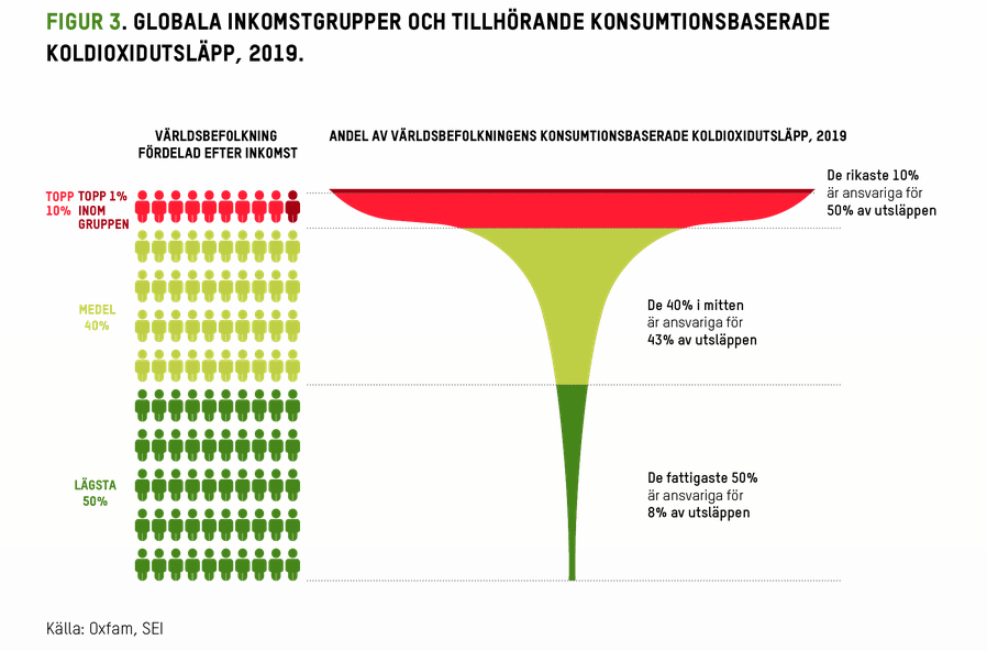 För att fortsätta Oxfams statistik så släppte de 10 procent rikaste i världen ut hälften av alla utsläpp. Jag återkommer till den siffran på slutet.
