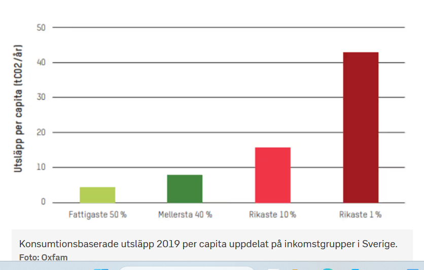 För att fortsätta Oxfams statistik så släppte de 10 procent rikaste i världen ut hälften av alla utsläpp. Jag återkommer till den siffran på slutet.
