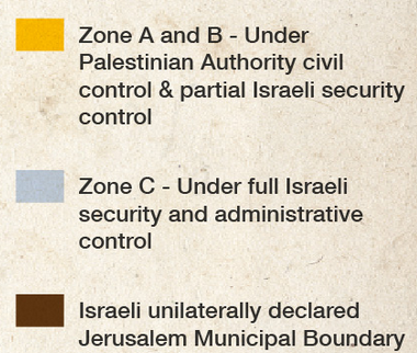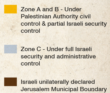 Område B – Områden med stor majoritet av palestinsk befolkning. Den palestinska myndigheten har ansvar för den offentliga verksamheten men Israel hanterar säkerhetsfrågor i koordination med PA.