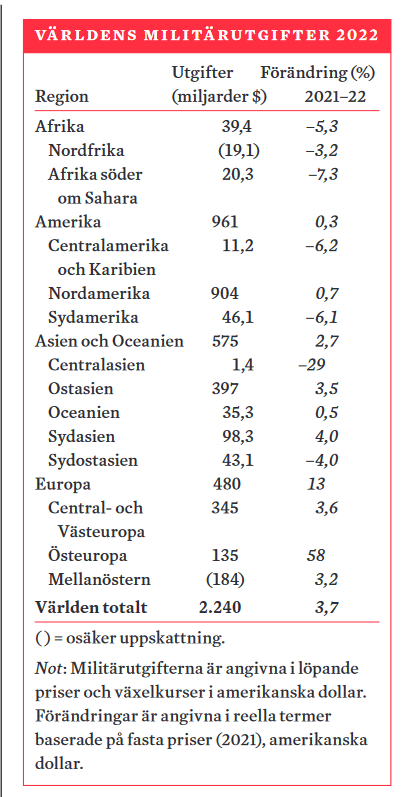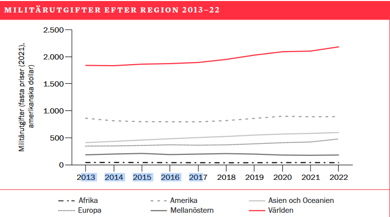 Allt mer pengar läggs på krigsmateriel. Under de senaste åtta åren har utgifterna för krigsmateriel ökat för att nå en höjdpunkt år 2022 med 2 240 miljarder dollar, motsvarande 25 048 miljarder svenska kronor.