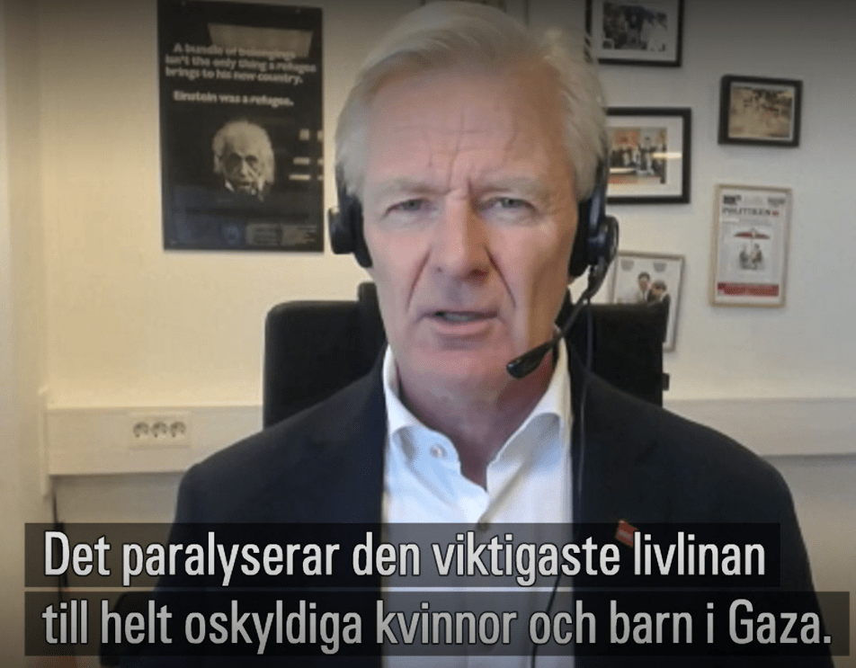 Han undviker att svara på den frågan, säger istället att han reagerar på situationen i Gaza – ”vi tänker på dom hela tiden”. Säger sedan att de tagit samma ställning som andra regeringar i Europa och anklagelserna från Israel ”var så pass allvarliga” att man måste gå till botten med detta. Han säger samtidigt att Sverige ökat sin humanitära hjälp (men inte till UNRWA). Men på frågan om detta kan ersätta UNRWAs arbete som står för 80 procent av hjälpen i Gaza påstår han att de nått fram bättre (?!)
