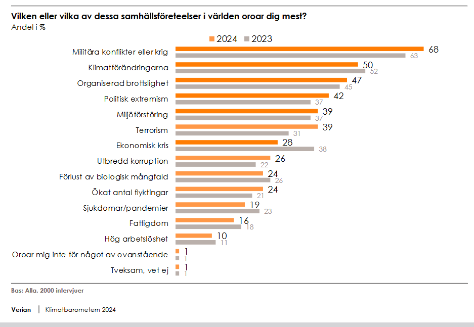 På frågan vad som oroar mest kommer föga förvånande krig först, men därefter anger 50 procent att de oroar sig för klimatförändringarna.