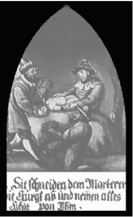 Mordet skulle ha skett i byn Rinn i Tyrolen. En kyrka byggdes upp runt en klippa kallad ”Judestenen” där barnet påstods ha dödats. På bilden härintill, som tills helt nyligen fanns kvar i kyrkan i Rinn, ser vi hur barnet hålls nere och får halsen avskuren. Att mördarna är judar visas av de kläder som kyrkan på den tiden tvingade judar att bära. En tredje figur samlar barnets blod i en skål. Kyrkan i Rinn blev på 1600-talet en kultkyrka dit pilgrimer vallfärdade och samtidigt en plats för antisemitism inom den katolska kyrkan. Biskopen Reinhold Stecher satte till slut stopp för dessa pilgrimsfärder, men först efter hårt motstånd från anhängare till kulten. Efter 1994 har det inte varit några pilgrimsfärder på officiell nivå. Men enligt museets text så är det fortfarande anhängare som vallfärdar till kyrkan i Rinn och ”judestenen” för att upprätthålla denna anti-semitiska kult.