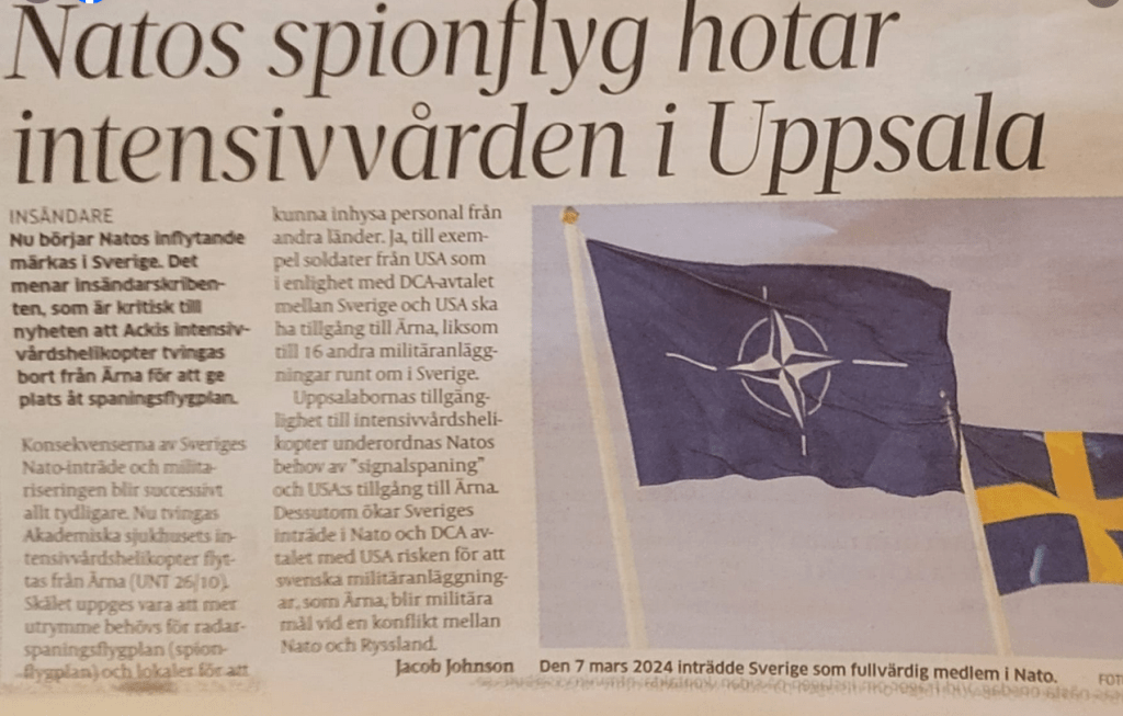 Uppsalabornas behov av en intensivvårdshelikopter underordnas alltså Natos behov av ”signalspaning” och USA:s tillgång till Ärna. Se där ännu en konsekvens av Nato-inträde och DCA-avtal.