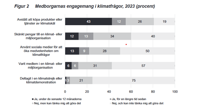 När det gäller individuella val så är det också 43 procent som under de senaste tolv månaderna avstått att köpa tjänster eller produkter av klimatskäl. Se bilden: