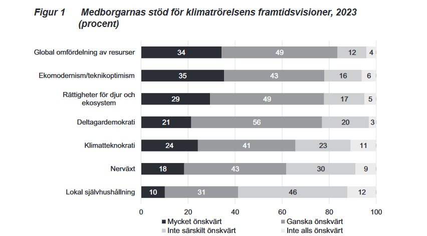 Mer omdebatterade visioner – såsom de om nerväxt och klimatteknokrati – stöds dock främst av kvinnor, av dem som oroar sig för klimat-förändringar, av sympatisörer till vänsterorienterade partier och av klimatengagerade personer.