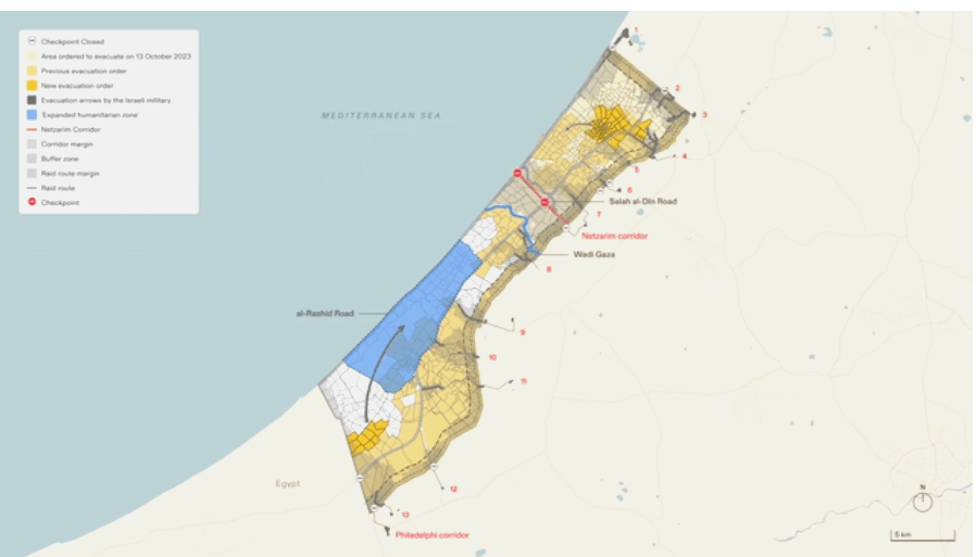 Deras analys ”avslöjar den nästan totala förstörelsen av det civila livet i Gaza”. De har också samlat in och analyserat evakueringsorder som utfärdats av den israeliska militären till palestinska civila: