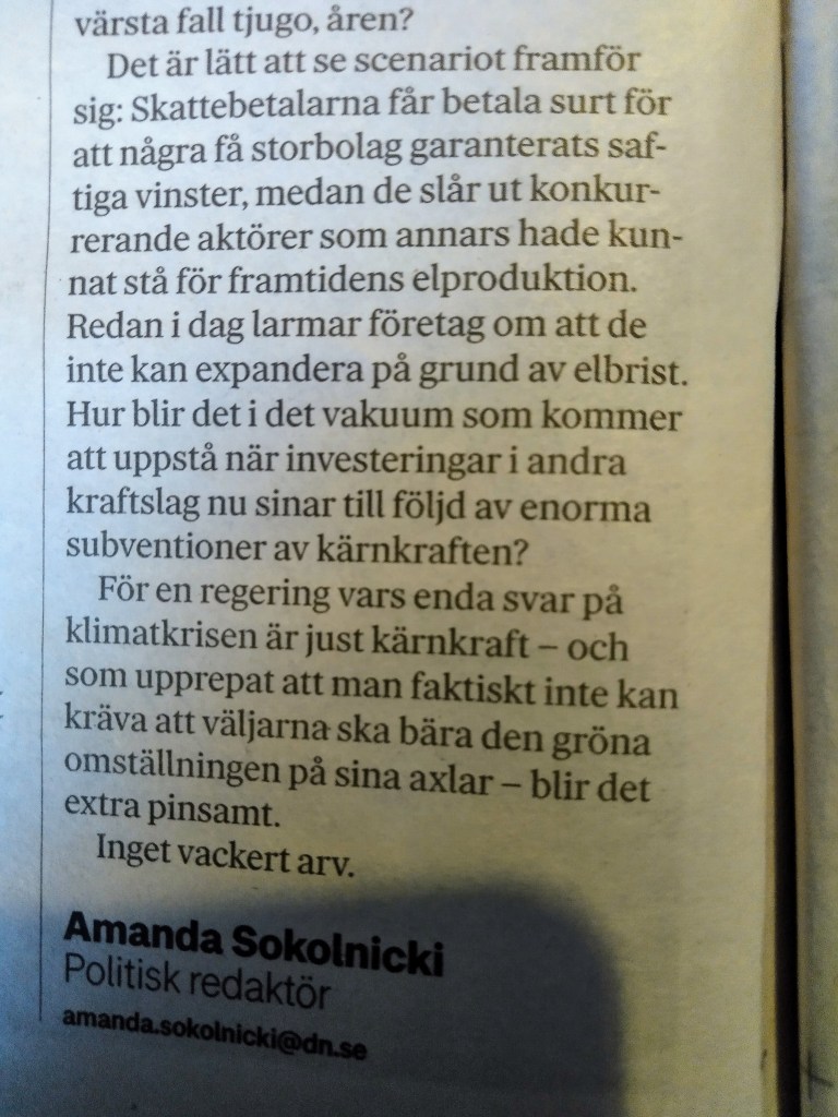 I augusti skrev jag om Tidö-regeringens stora och dyra satsning på kärnkraften. En satsning som i praktiken kommer ske på bekostnad av andra energislag som sol och vind. Och en satsning som kommer att kosta mycket även rent ekonomiskt för befolkningen eftersom kapitalägarnas risker minimeras och deras vinster skyddas.