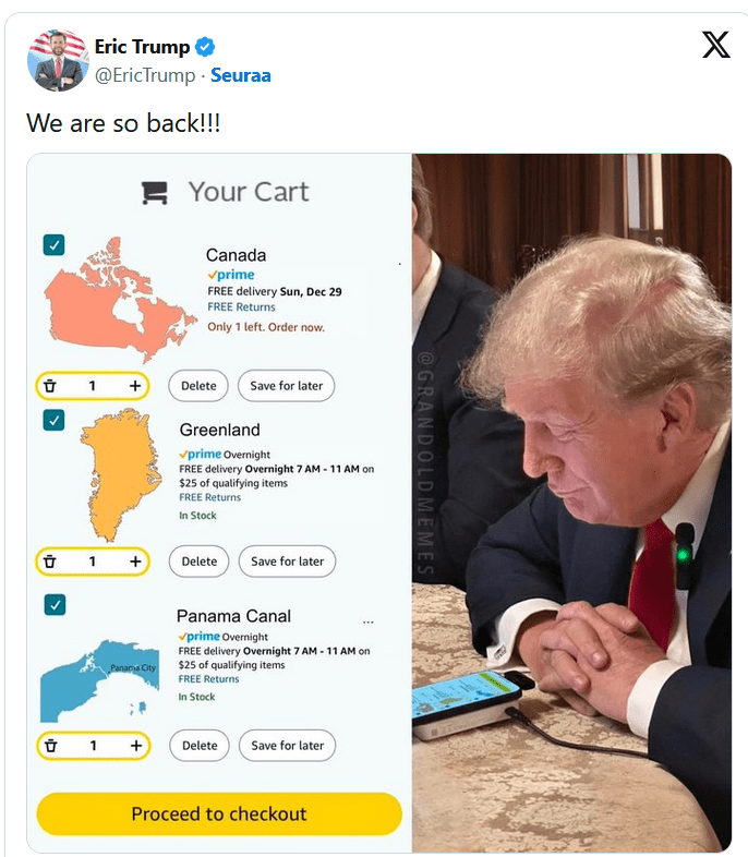 När han senast var president så sa han (år 2019) istället att ”det skulle vara trevligt att äga Grönland” och att han ”i grund och botten” såg det som ”en stor fastighetsaffär”. Han skulle köpa Grönland av Danmark.