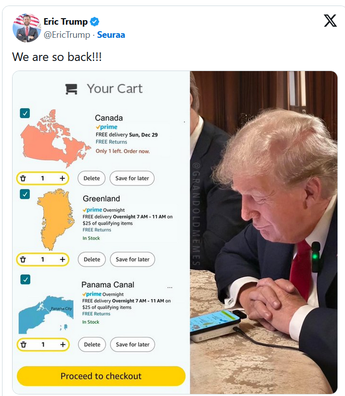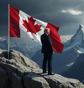 Men är det inte jämförbart med det som Trump faktiskt har gjort (på riktigt) när han ”skojar” med Kanadas ledare Trudeau om att Kanada kan få bli USA:s 51:a delstat. Ja han har till och med varit så ”rolig” att han lagt ut den här fejkade bilden på sig själv med Kanadas flagga.