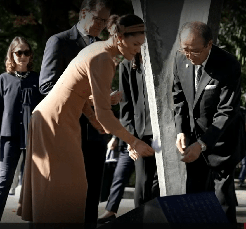 I augusti i år var det 80 år sedan USA fällde sina atomvapen över de japanska städerna Hiroshima och Nagasaki. Kungaparet besökte minnesparken för Hiroshimas offer ”för att visa respekt och hedra deras minne” enligt tidningen Nöjeslivet och Svenska Damtidning som också rapporterar från besöket. De skriver att det var ”En gripande stund där Kronprinsessan syntes stå med huvudet böjt och stryka bort en tår”.