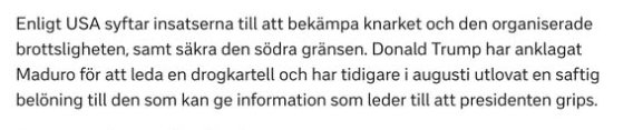 USA:s president har beordrat dessa attacker utan att utverka något stöd från kongressen. Han har till och med postat videos från angreppen på sin internet-plattform med det märkliga namnet ”Truth Social”. Dessutom mobiliserar han nu CIA inne i Venezuela.