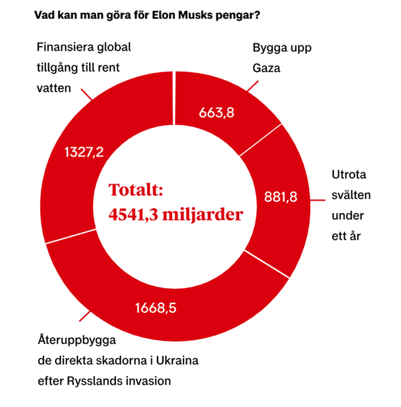 Ett annat och intressantare sätt att se på saken är att titta på vad pengarna (de 4 546,6 miljarder kronorna) skulle kunna användas till istället för att låta Musk själv disponera dem.